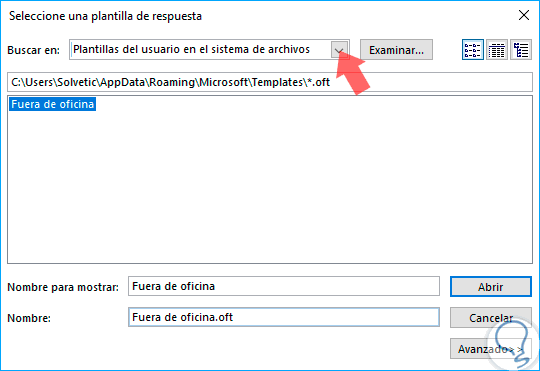 Allí pulsaremos en la línea “Una plantilla determinada” ubicada en la parte de abajo y en la ventana desplegada seleccionamos la opción “Plantillas del usuario en el sistema de archivos” en el campo “Buscar en”: