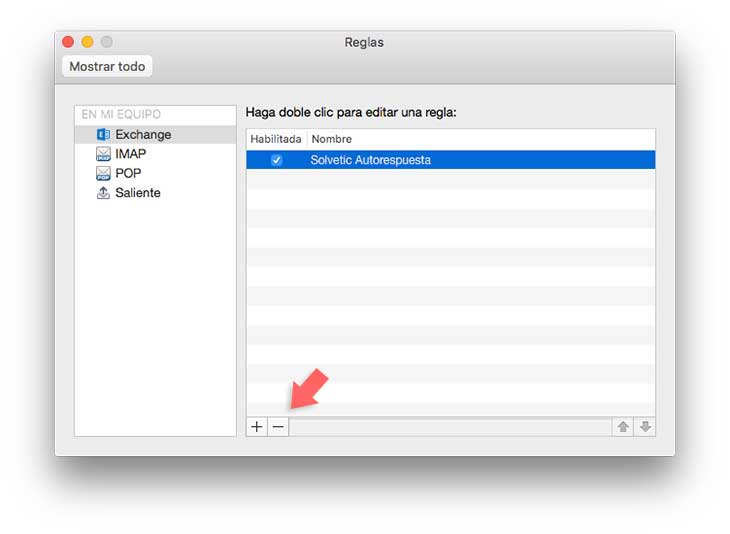 Una vez abierta la opción Reglas del menú Herramientas debemos seleccionar Exchange y allí pulsar el ícono + para agregar una nueva regla.