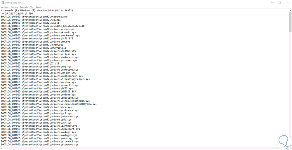 Al tener el registro de arranque habilitado será posible analizar los aspectos internos del proceso de arranque en el equipo con Windows 10. El registro de arranque será almacenado en la ruta C:\Windows\ntbtlog.txt y podremos abrirlo con cualquier aplicación de editor de texto favorita como el Bloc de notas o Notepad ++.