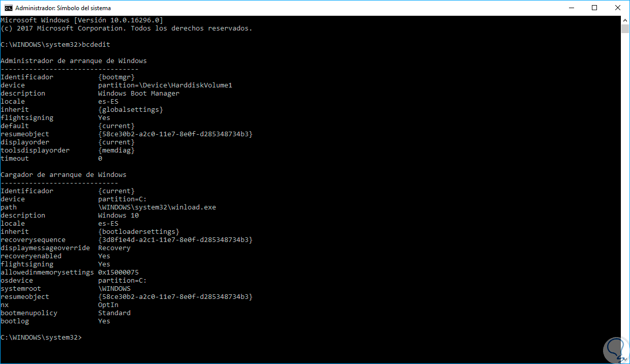 Debemos tener en cuenta el identificador del Sistema Operativo para el cual deseamos habilitar el registro de inicio, esto en caso de contar con diversos sistemas operativos instalados. Este identificador lo encontramos en la línea “Identificador” en el grupo “Cargador de arranque de Windows” y podemos ver que en este caso es {current}.