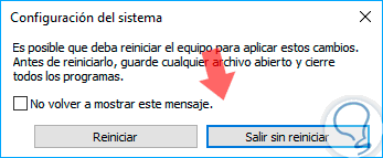 Pulsamos en Aplicar para guardar los cambios y en Aceptar para salir de la configuración y será desplegado el siguiente mensaje. Allí podemos seleccionar la opción “Reiniciar” y de forma automática el sistema será reiniciado o pulsar en “Salir sin reiniciar” para reiniciar y generar el archivo más adelante.