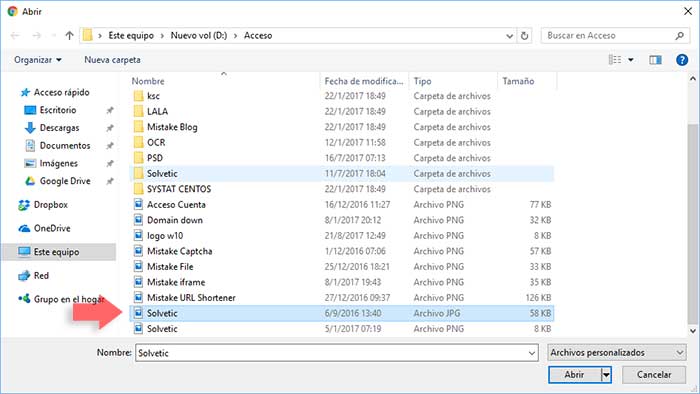 En este caso seleccionamos la opción Cargar una foto y pulsamos sobre "Seleccionar una foto de tu equipo" y en la ventana desplegada seleccionaremos la foto y pulsamos en el botón Abrir: