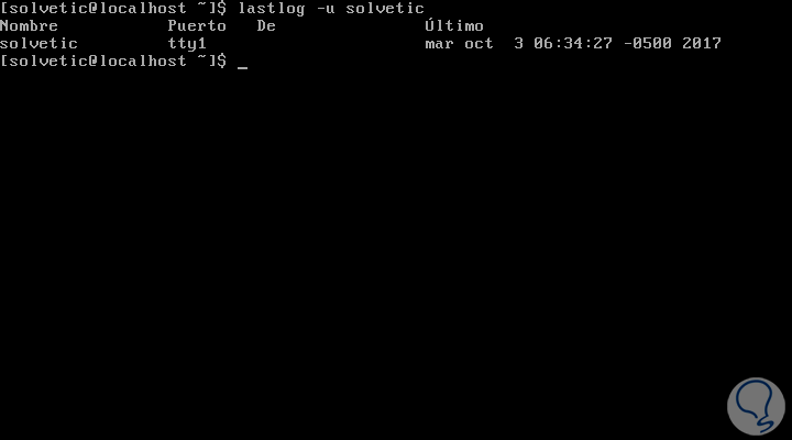 Allí podemos usar solo lastlog o lastlog -u usuario para un usuario específico: