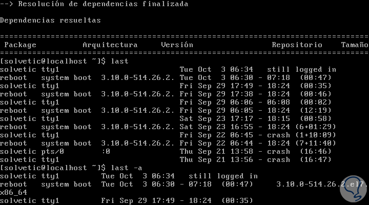 Los comandos last o lastb despliegan una lista de los últimos usuarios registrados en el sistema. Podemos usar solo last o last -a para indicar el nombre del host en la última columna:
