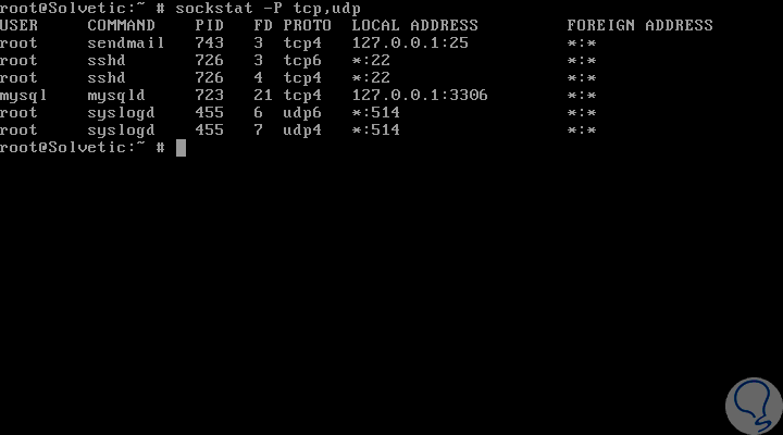 sockstat -P tcp -p 443 [Despliega los puertos TCP HTTPS] sockstat -P udp -p 53 [Despliega los puertos UDP DNS] sockstat -P tcp -p 443,53,80,21 [Despliega los puertos TCP y UDP]