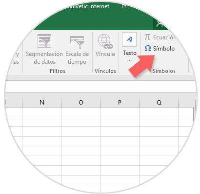 En algunos casos especiales será necesario que añadamos dicho símbolo en algún libro de trabajo de Excel 2016 y para esto seleccionamos la celda donde ira el símbolo de Copyrigth y vamos al menú Insertar y nos dirigimos al grupo Símbolos:
