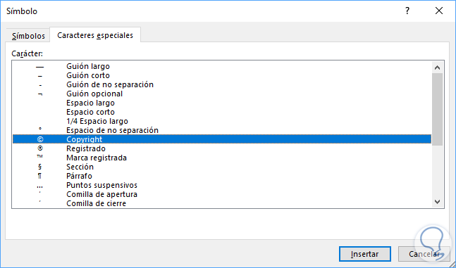 Allí pulsamos en el botón Símbolo y en la ventana desplegada vamos a la pestaña Caracteres especiales y en el listado ofrecido seleccionaremos el Copyright: