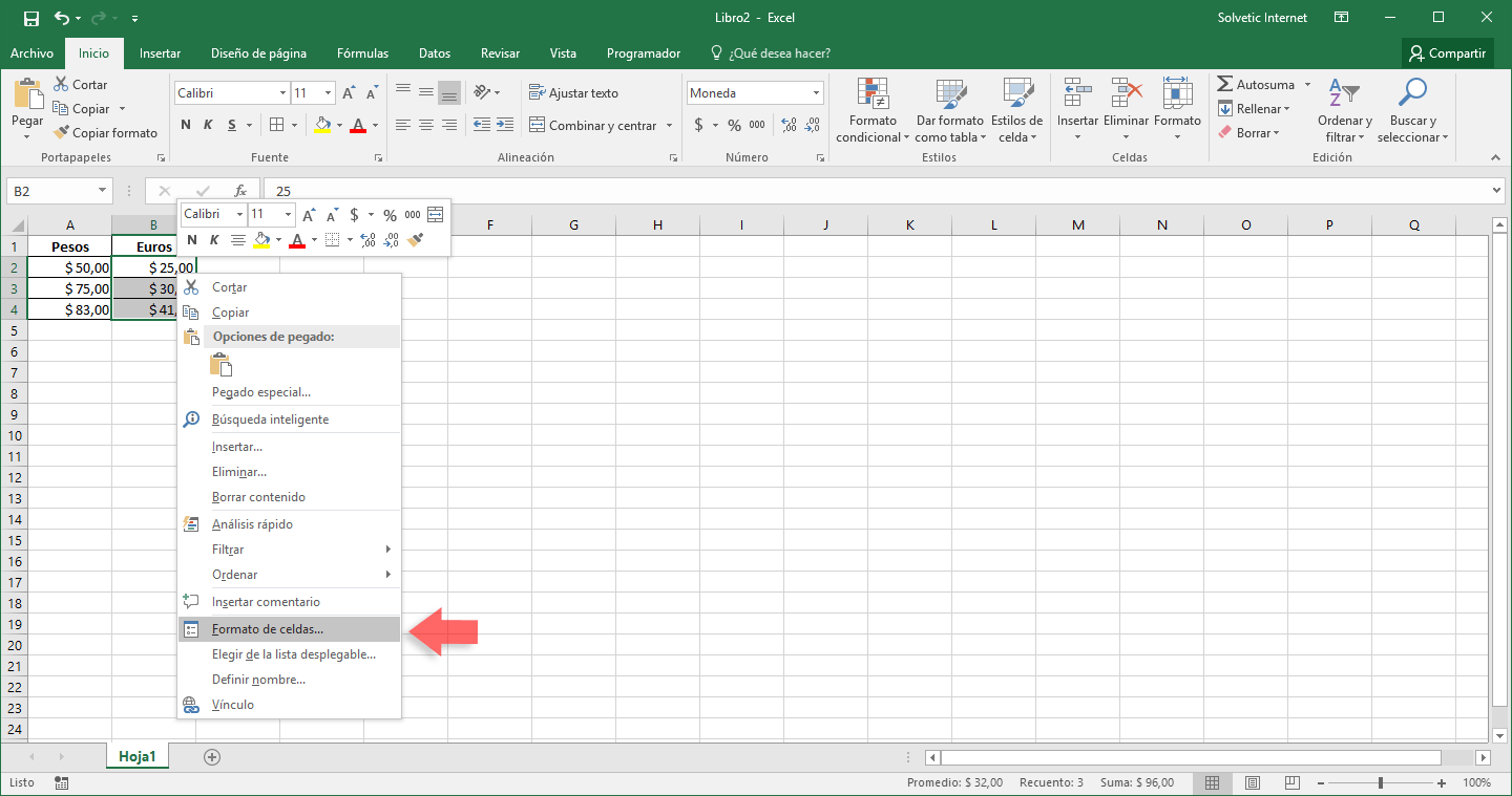 Ahora seleccionaremos las celdas que deseamos editar, damos clic derecho sobre ellas y seleccionamos la opción Formato de celdas:
