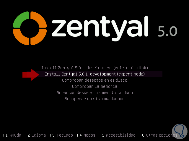 Pulsamos Enter para confirmar y en la siguiente ventana seleccionaremos la opción Install Zentyal 5.0.1-development (expert mode) y pulsamos Enter: