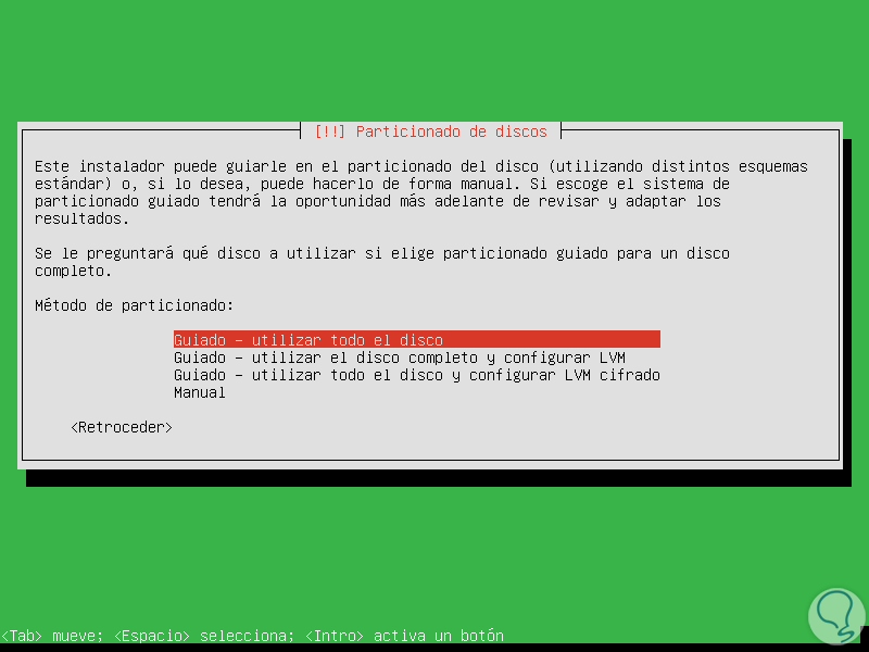 A continuación el sistema iniciará la detección de discos y será desplegada la siguiente ventana donde seleccionaremos la opción Guiado – utilizar todo el disco:
