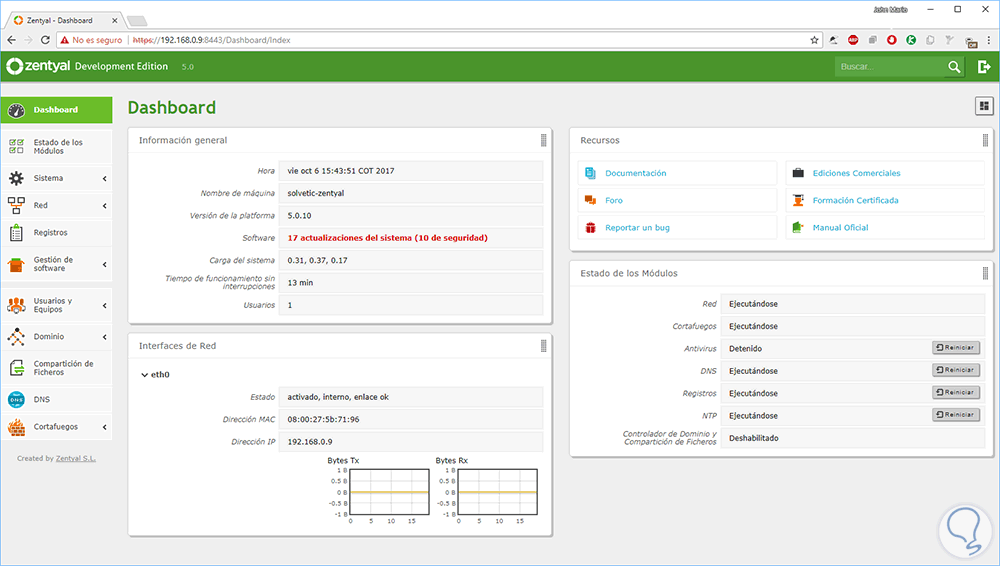 Desde el Dashboard tenemos la oportunidad de configurar todos los parámetros que hemos instalado en Zentyal: