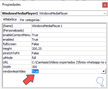 Ahora debemos fijarnos en la parte de abajo en el desplegable que pone "Windowslessvideo" para seleccionar la opción que pone "True". Este paso es importante para que funcione la reproducción del vídeo.