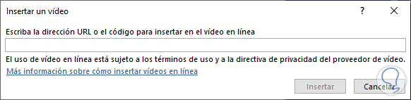 Ahora veremos que aparece una nueva ventana en la que podemos introducir la URL del vídeo que queremos compartir en el documento Word.
