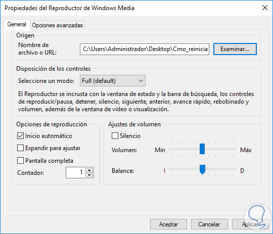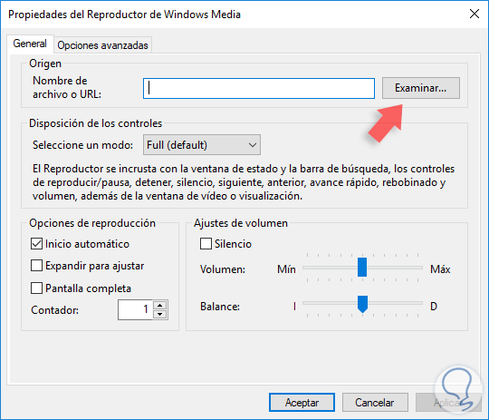 Allí pulsamos en el botón Examinar y debemos ir a la ruta donde está el video a reproducir. Allí podemos configurar todos los parámetros necesarios del video tales como el modo de pantalla, el volumen, etc, una vez definidos estos puntos pulsamos en Aplicar y Aceptar para guardar los cambios.