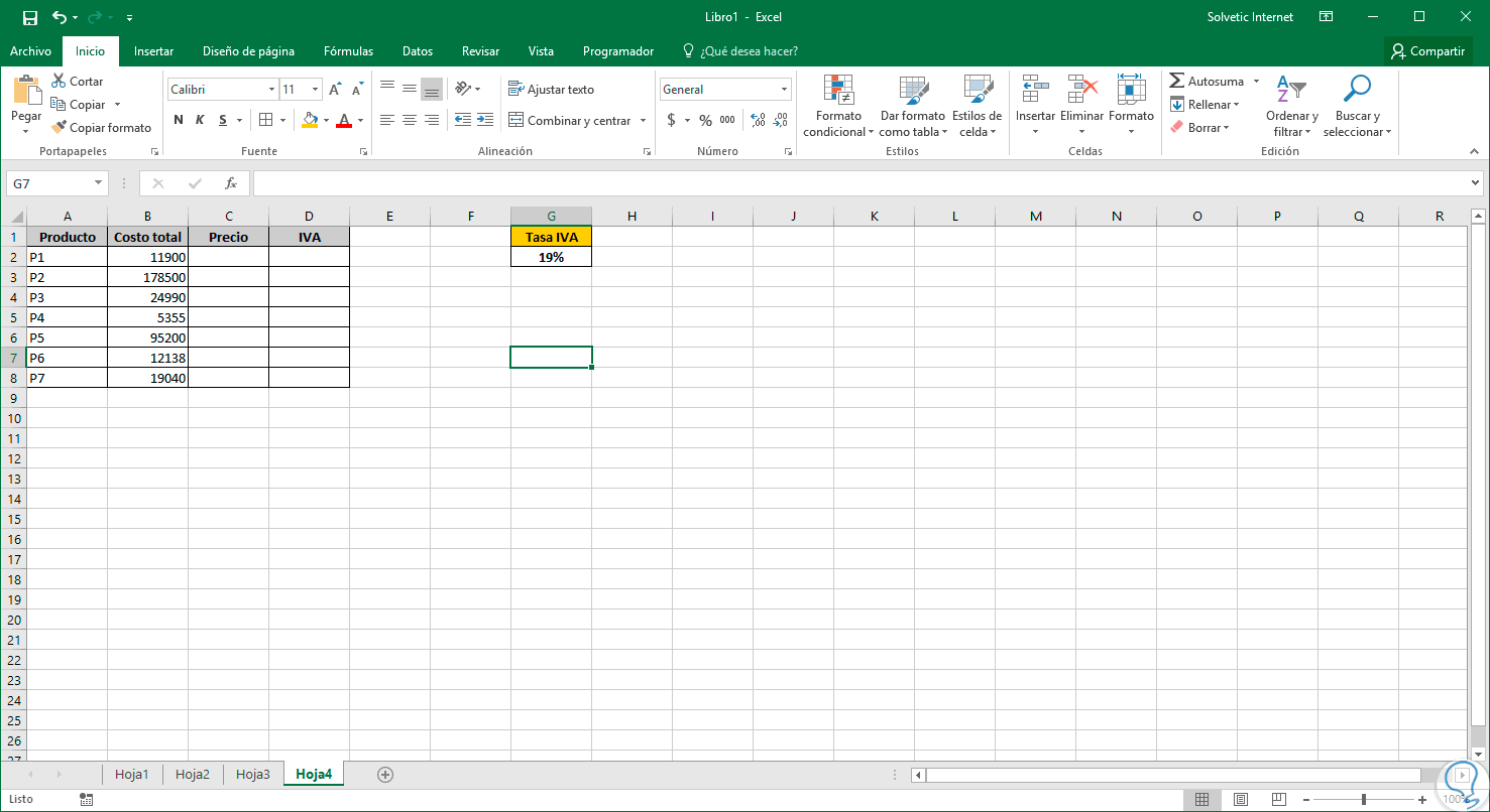 1. Calcular IVA de un solo precio en Excel 2013 o 2016
