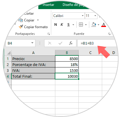 Para saber qué valor corresponde al IVA multiplicaremos la celda B1 por la celda B2: