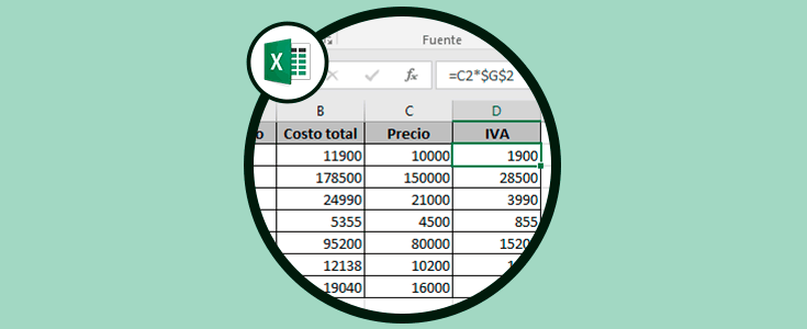 Allí estamos tomando el precio del producto y lo multiplicamos por la tasa del IVA y para hacer esta fórmula fija damos clic sobre ella y pulsamos la tecla F4: