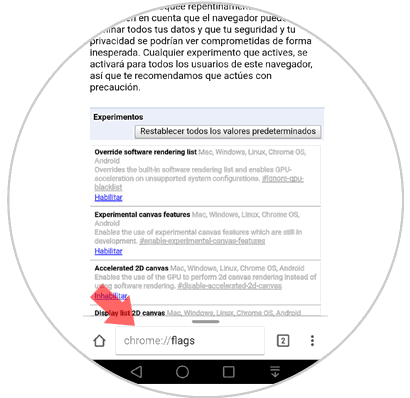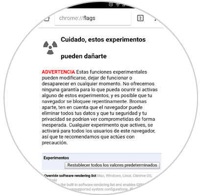 chrome://flagsPodemos ver que se despliega el siguiente mensaje de advertencia: Esto se debe a que dentro de esta ruta encontramos la mayoría de configuraciones del navegador y algún cambio mal realizado puede afectar su comportamiento.
