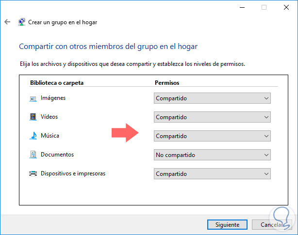 Pulsamos en Siguiente y debemos asegurarnos que las líneas Videos y Música estén con la opción Compartido: