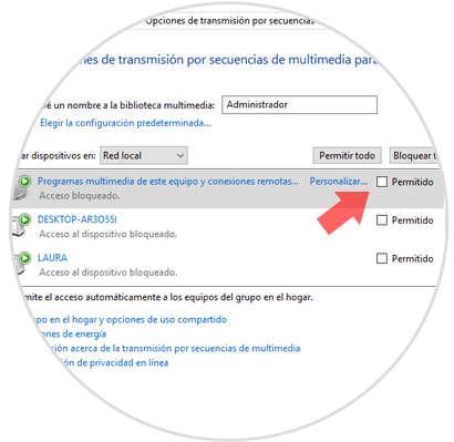 En esta sección debemos detener a otros medios como TV de transmitir el contenido del equipo donde se ha creado el Grupo Hogar. Para esto pulsamos en la línea Permitir que todos los dispositivos de esta red, como televisores y consolas de juego, reproduzcan mi contenido compartido y en las opciones desplegadas desactivamos la casilla Permitido: