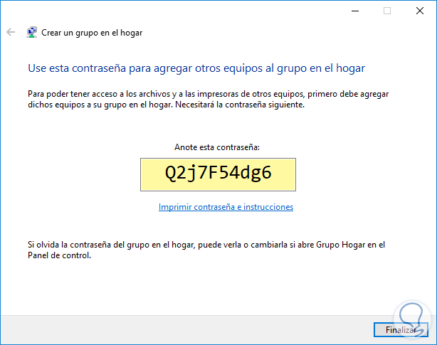 Pulsamos en Siguiente y el sistema nos suministrara la contraseña de acceso al Grupo Hogar. Pulsamos en Finalizar para salir del asistente.