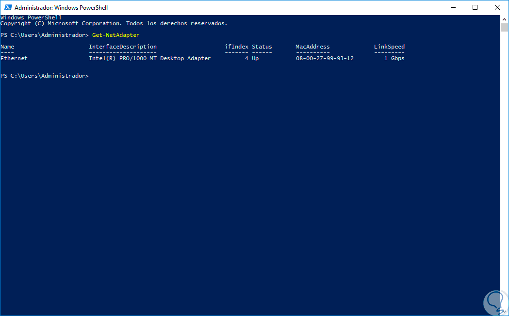 Para esto accederemos a una consola de Windows PowerShell como administradores y ejecutaremos el siguiente cmdlet para ver los adaptadores de red disponibles:
