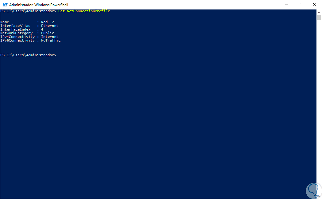 Podemos comprobar de nuevo que el cambio ha sido correcto ejecutando Get-NetConnectionProfile: