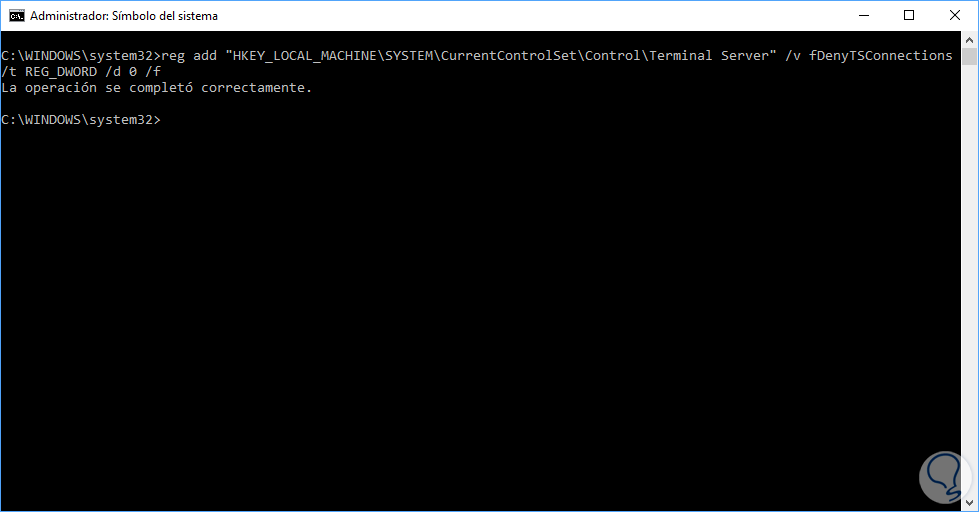 Solvetic enseñará en esta oportunidad como habilitar el escritorio remoto en Windows 10 a través del símbolo del sistema.