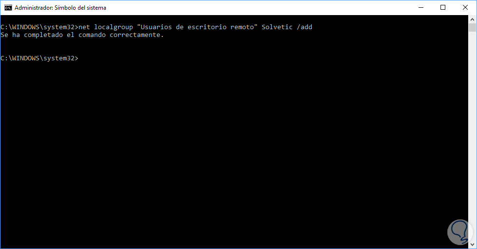 Ahora, debemos agregar una cuenta de usuario al grupo de usuarios de escritorio remoto. Para esto, ejecutaremos el siguiente comando de net localgroup: