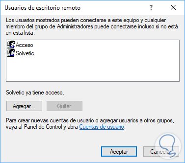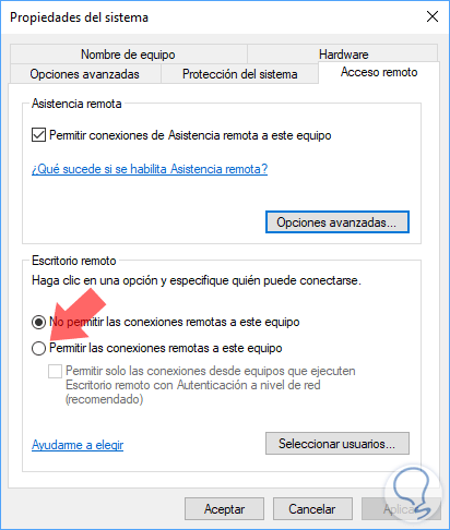 Allí podemos seleccionar los usuarios que tendrán acceso remoto desde la opción Seleccionar usuarios y asimismo habilitar el Escritorio remoto activando la casilla Permitir las conexiones remotas a este equipo.