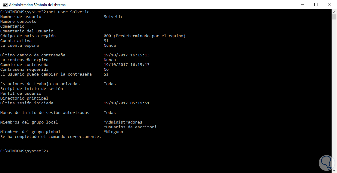 Podremos comprobar los grupos del usuario seleccionado ejecutando lo siguiente. Allí vemos que está dentro del grupo indicado