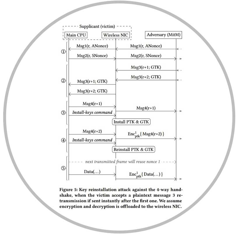 Sin embargo, como los mensajes se pueden perder o descartar, el Punto de acceso (AP) retransmitirá el mensaje 3 si no recibió una respuesta apropiada como acuse de recibo. Como resultado de esto, el cliente puede recibir el mensaje 3 varias veces y cada vez que recibe este mensaje, reinstalará la misma clave de cifrado y, por ello, reiniciará el número de paquete de transmisión incremental y recibirá el contador de reproducción utilizado por el protocolo de cifrado.