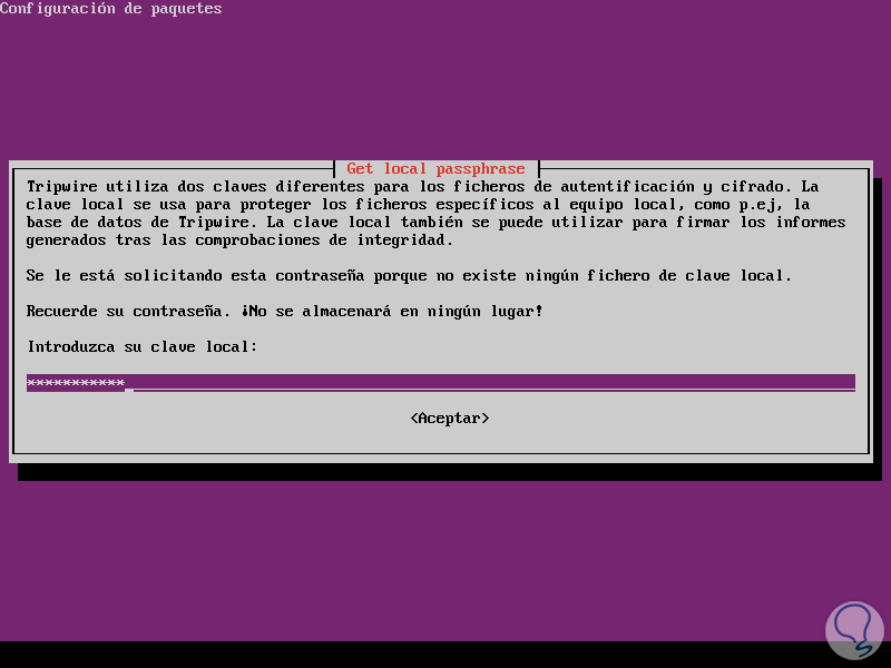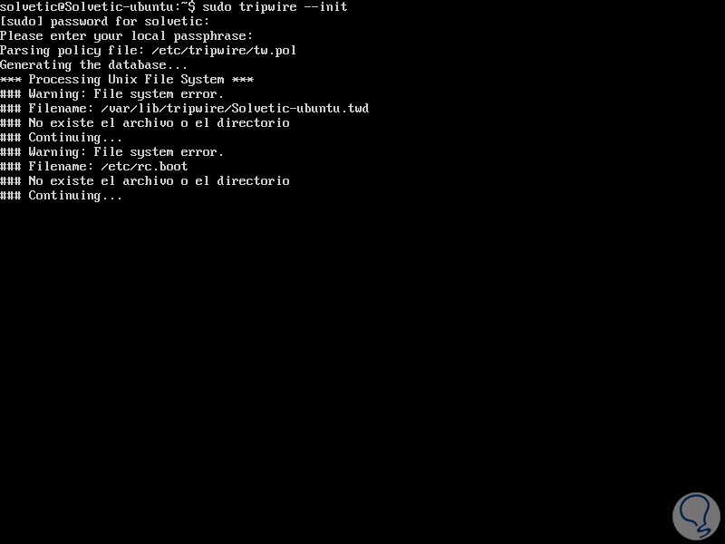 sudo tripwire –initAlli ingresaremos la clave de administrador y luego la clave local que fue configurada durante la instalación: