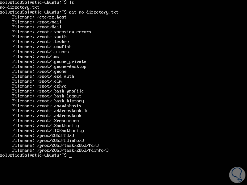 sudo sh -c "tripwire --check | grep Filename > no-directory.txt"Posteriormente podremos ver el contenido de dicho archivo ejecutando lo siguiente: