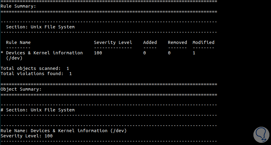Hemos añadido un nuevo archivo en el directorio /dev y una vez ejecutemos la comprobación de Tripwire podemos ver que la violación ha sido detectada: