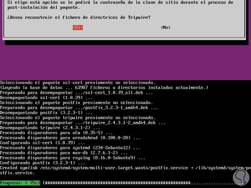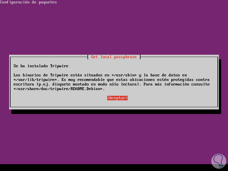 Una vez asignada esta contraseña y así hemos completado el proceso de instalación de Tripwire en Ubuntu 17.10: