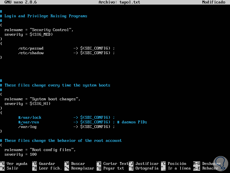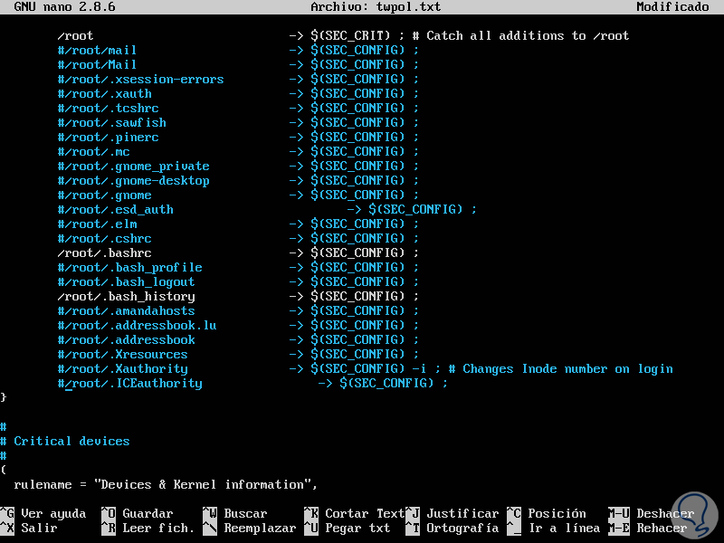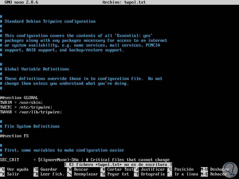 cd /etc/tripwire/ nano twpol.txtVeremos lo siguiente: