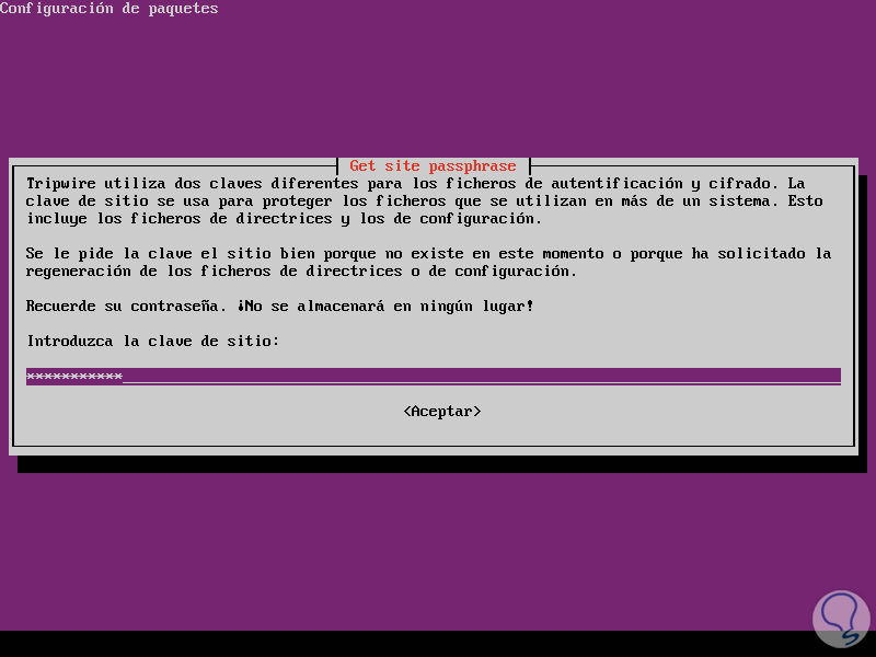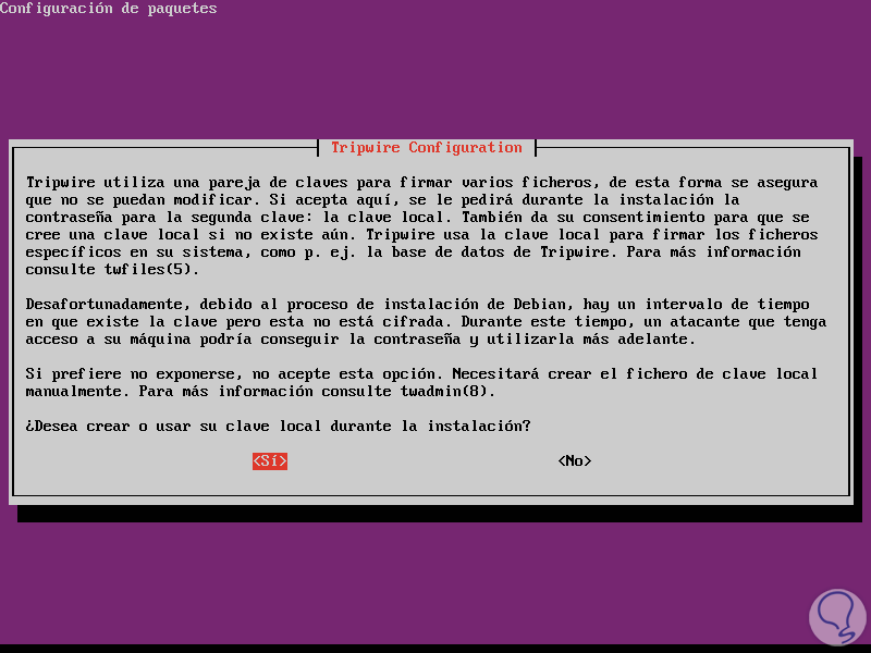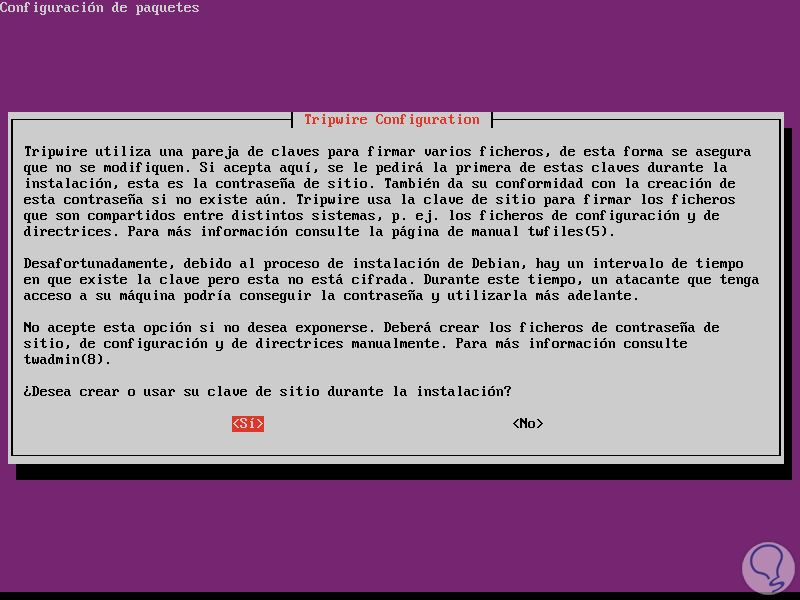 Pulsamos de nuevo en Aceptar y en la siguiente ventana será necesario crear una nueva clave de sitio para Tripwire, en este caso seleccionamos Sí y pulsamos Enter para continuar: