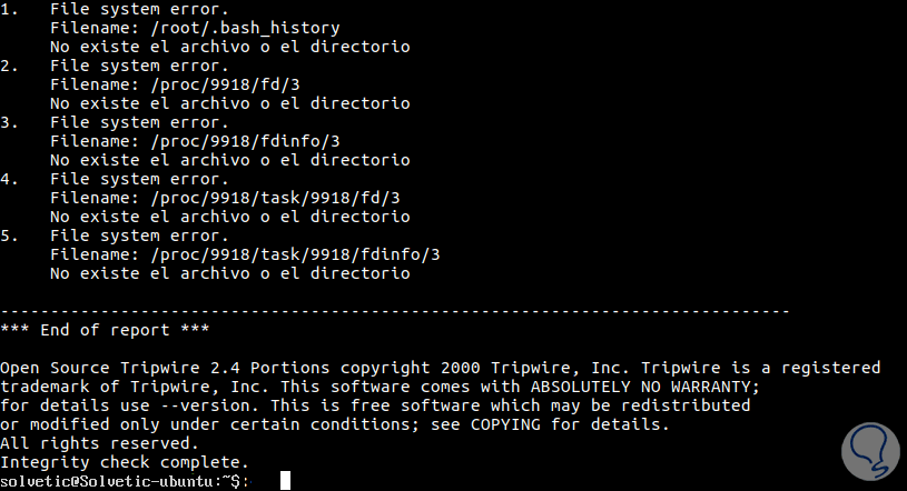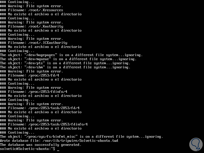 Como resultado final será lo siguiente. Podemos ver el error No existe el archivo o el directorio por lo cual, para resolver este error, debemos editar el archivo de configuración de Tripwire y regenerar la configuración.
