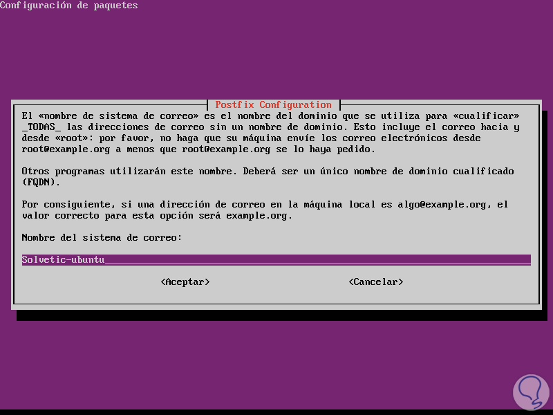 Al pulsar en Aceptar, en la siguiente ventana para el nombre del sistema de correo, dejaremos el valor predeterminado: