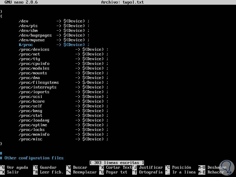 El siguiente paso consiste en ir al directorio de configuración de Tripwire y editar el archivo de configuración twpol.txt ejecutando lo siguiente: