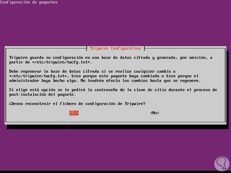 En este caso tenemos los ficheros clave de Tripwire, en este caso seleccionamos Si y pulsamos Enter para proseguir. Ahora, debemos confirmar si reconstruiremos el fichero de configuración de Tripwire ya que se han realizado cambios en los ficheros clave. Seleccionamos Si y pulsamos Enter para seguir el proceso.