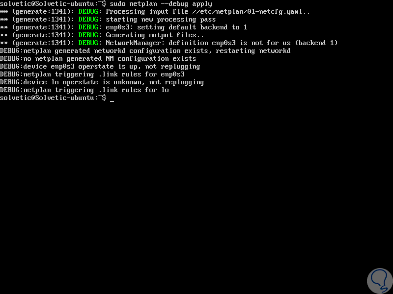 O también podemos usarlo con el modificador “–debug” para obtener algún resultado útil si el análisis del archivo de configuración de netplan fue exitoso: