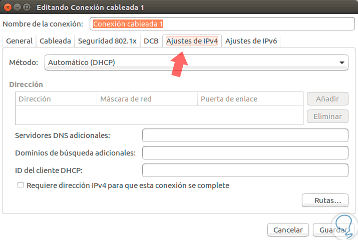 En la nueva ventana que será desplegada vamos a la pestaña “Ajustes de IPv4” donde veremos lo siguiente: