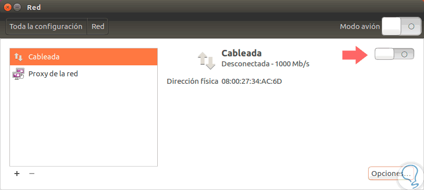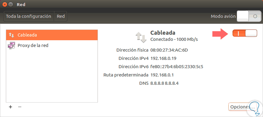 Una vez definamos estos valores pulsamos en el botón “Guardar” para aplicar los cambios. Ahora, debemos apagar el interruptor de la conexión para desconectar el adaptador de red: