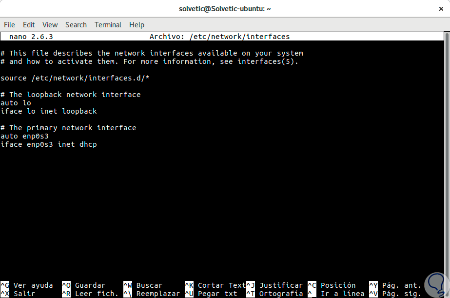 Allí podemos ver el nombre de nuestra interfaz de red y vemos que está definida por DHCP. Allí modificaremos lo siguiente: