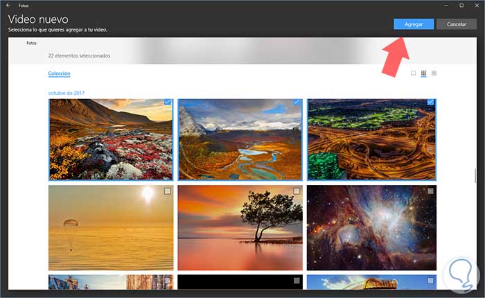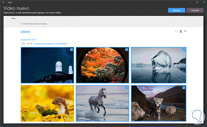 Es posible que deseemos añadir más imágenes o videos al proyecto seleccionado, para ello basta con pulsar en el botón Agregar fotos y videos ubicado en la parte superior izquierda y será desplegada la respectiva ventana donde seleccionaremos los nuevos elementos.