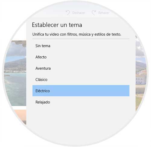 Si no deseamos seleccionar un estilo de texto, banda sonora y transición, podemos aplicar un tema el cual hará todo en un solo paso, para ello debemos asegurarnos de agregar primero todas las imágenes y videos que deseamos a la línea de tiempo, y luego desde la barra de herramientas, en la esquina superior derecha, dar clic en el botón Temas.