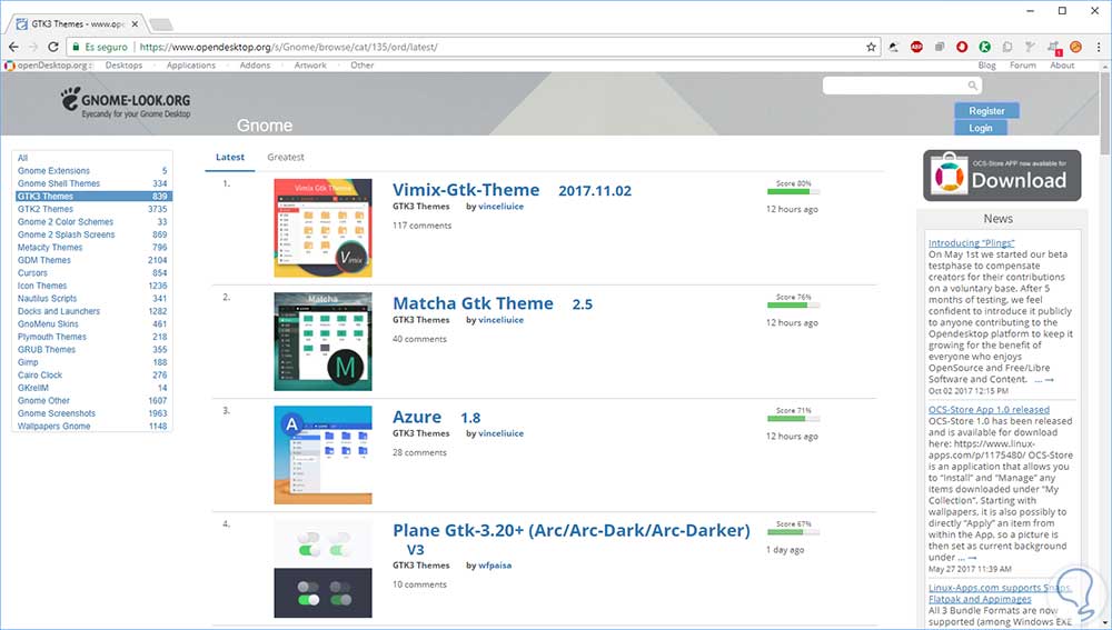 Esta es una de las formas más prácticas de proporcionar temas para Ubuntu 17.10. Por ejemplo, en al sitio web de gnome-looks en busca de temas, encontraremos que los temas vienen en forma de archivo zip o tar.