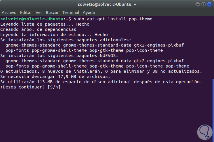 Allí ingresamos la letra S para confirmar la descarga e instalación de los paquetes. Esto instalará el ícono Pop OS, GTK3 y el tema GNOME Shell en Ubuntu 17.10, y no debemos hacer nada más, ya que ahora los nuevos temas estarán disponibles en el sistema y solo será necesario cambiarlos.